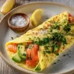 A fluffy omelet featuring creamy avocado and smoky salmon, perfect for breakfast or brunch.