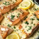 A delicious baked salmon recipe featuring a creamy lemon butter sauce, perfect for family gatherings and weeknight dinners.