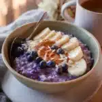 A deliciously nutritious oatmeal dish made with oats, blueberries, and almond milk, perfect for busy mornings and family brunches.