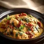 A rich and creamy Tuscan chicken dish made effortlessly in a crockpot, perfect for family gatherings or cozy weeknight dinners.