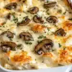A delicious and comforting casserole featuring tender chicken and earthy mushrooms in a creamy garlic sauce, perfect for a quick weeknight meal.