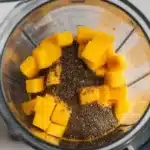 - In a blender, combine the diced mango, chia seeds, almond milk, banana, and honey.