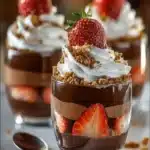 A delightful dessert featuring layers of rich chocolate mousse, fresh strawberries, and fluffy whipped cream that’s perfect for any occasion.